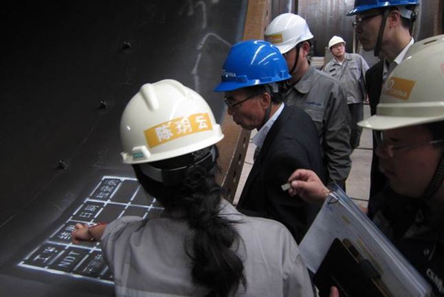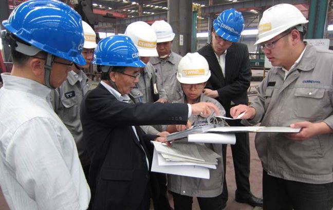 圖為:Kazuo Takaku (左三)在BT車間檢查卷板機(jī)點(diǎn)檢記錄