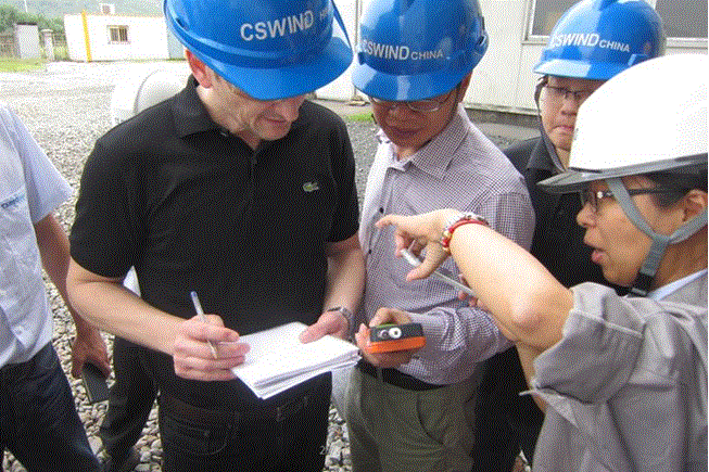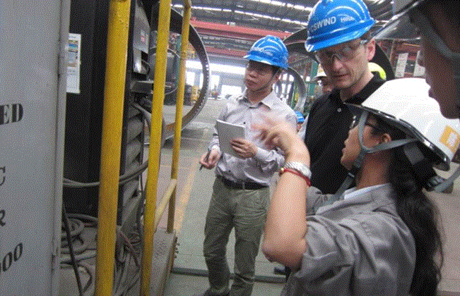 圖為:Mr. Palle Lund(左二)和Mr. Qiu 在黑塔車間就焊機的校準提問