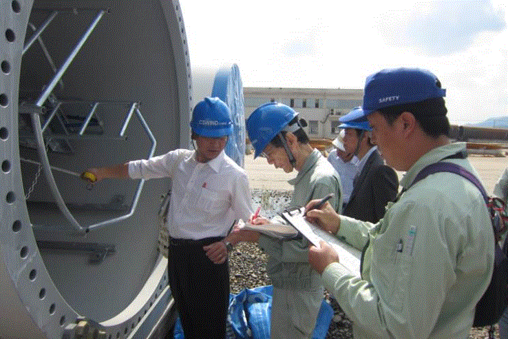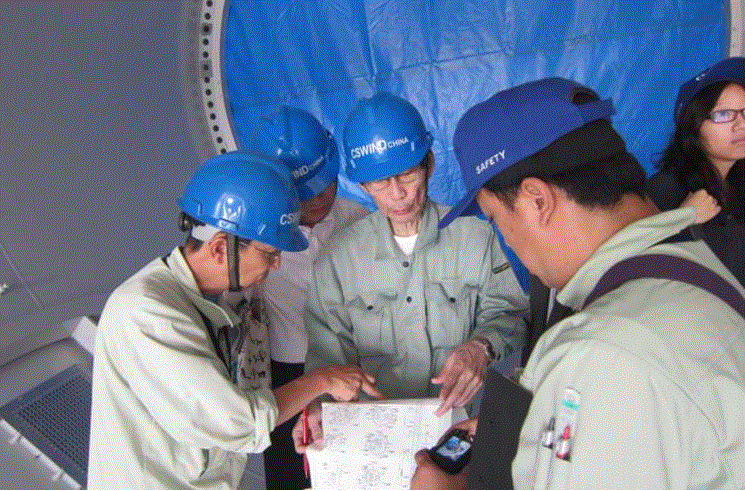 圖為:業主代表KAZUHIKO OKUMOTO(左一)和MASAKI SHIBANO(左二)檢驗塔筒內部組裝情況