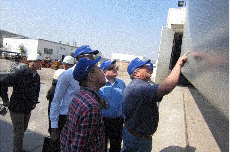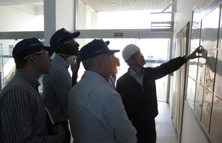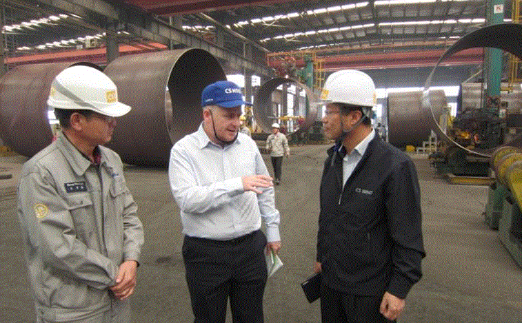 圖為:技術(shù)工程師 Mike Fairhurst (右一)在白塔參觀噴漆成品塔節(jié)