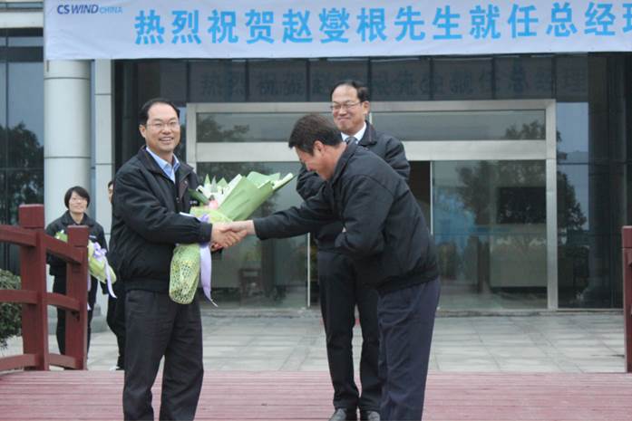 圖為:趙燮根(前右)總經(jīng)理代表重山風(fēng)力中國全體員工向前任總經(jīng)理劉容銑(前左)理事贈送鮮花